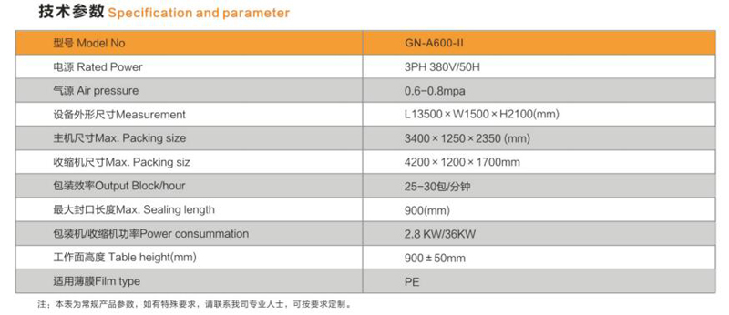 GN-A600全自動直線式包裝機是基于包裝薄膜受熱收縮的特性,利用光電開光傳感器在線檢測,采集信號由PLC(可編程控制器)程序集中控制處理,采用輸送帶連續式進瓶,分道雙進、分瓶板分列,閘門式分組,連續推桿推瓶裹膜,加熱切刀封切成包,加熱通道收縮冷風冷卻定型等機構來完成整個包裝全過程。
